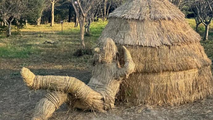 展廳外就是一片稻田,還零星擺列着稻草編成的牛、羊、人以及簡陋的草屋和木骨泥牆,這些別具匠心的設計,一下子就讓時光模糊了,有了強烈代入感。草鞋山可能確實曾是座名副其實的山,但歲月打磨下,現在只剩下一米左右高的土墩了。公園中央有座高臺,叫夷陵山,高約十米,地面之下還有五米。專家發現它其實不是自然形成的山體,而是一代代先民生活生產堆積出來的,文化層非常豐富,因此,這座山就是一件極其重要的文物。