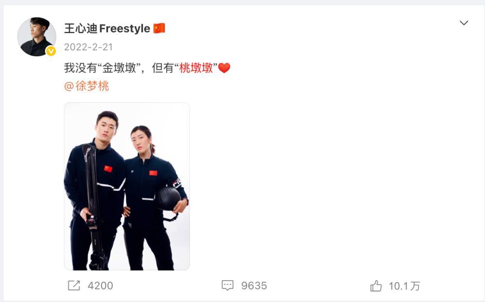 2022年北京冬奧會,徐夢桃在家門口圓夢奪冠。賽後,王心迪在社交平臺上卡點發文:“我沒有‘金墩墩’,但有‘桃墩墩’。”徐夢桃秒回:“桃墩墩在這裏”。之後,兩人步入婚姻殿堂,被網友們稱爲“桃心夫婦”。