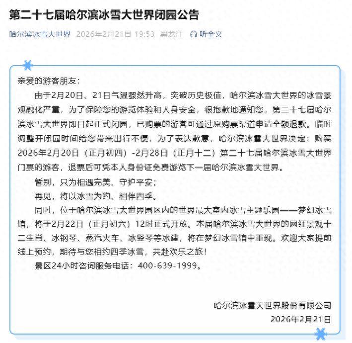 由於2月20日、21日氣溫驟然升高,突破歷史極值,哈爾濱冰雪大世界的冰雪景觀融化嚴重,爲了保障您的遊覽體驗和人身安全,很抱歉地通知您,第二十七屆哈爾濱冰雪大世界即日起正式閉園,已購票的遊客可通過原購票渠道申請全額退款。臨時調整開閉園時間給您帶來出行不便,爲了表達歉意,哈爾濱冰雪大世界決定:購買2026年2月20日(正月初四)-2月28日(正月十二)第二十七屆哈爾濱冰雪大世界門票的遊客,退票後可憑本人身份證免費遊覽下一屆哈爾濱冰雪大世界。