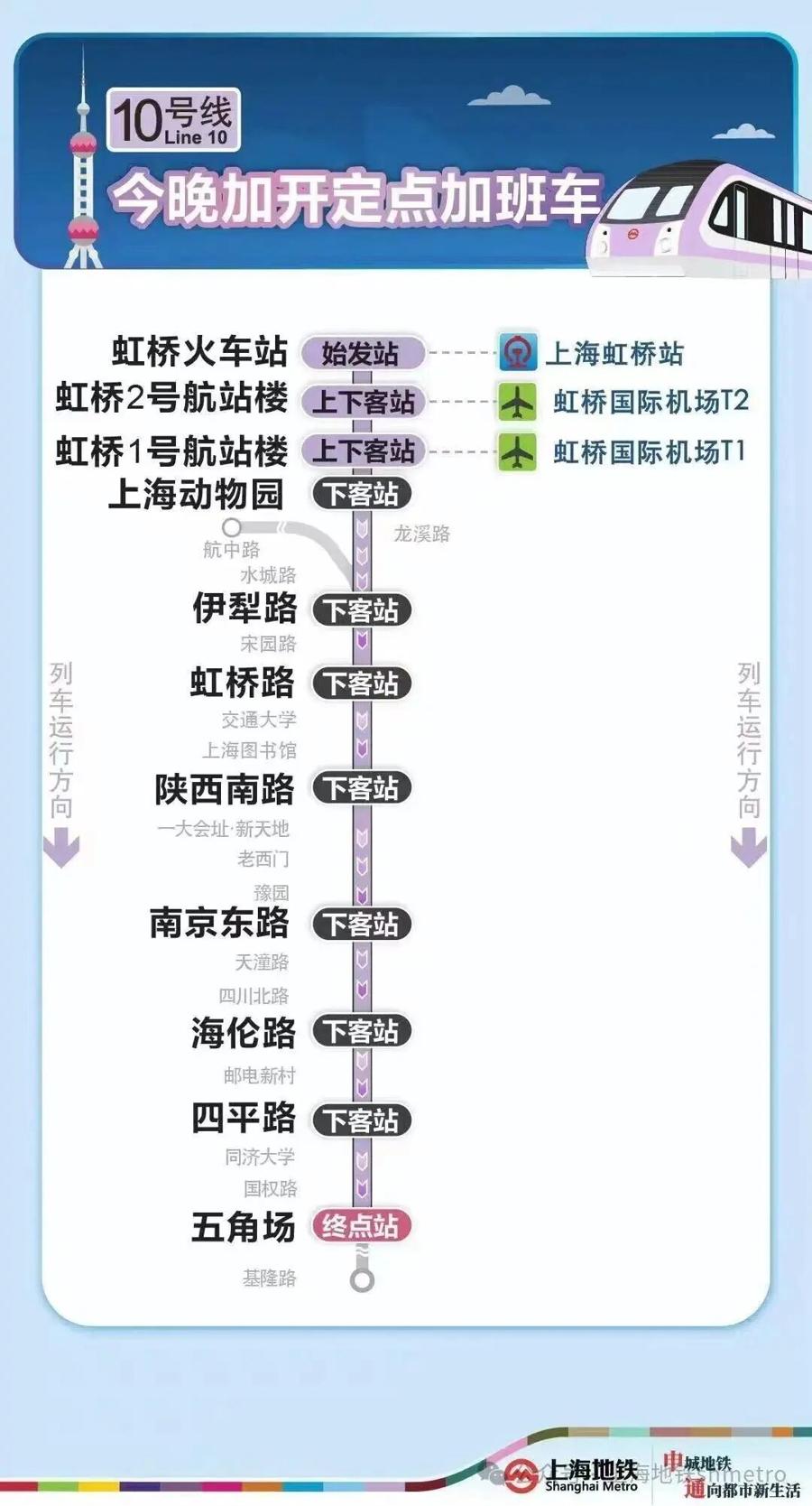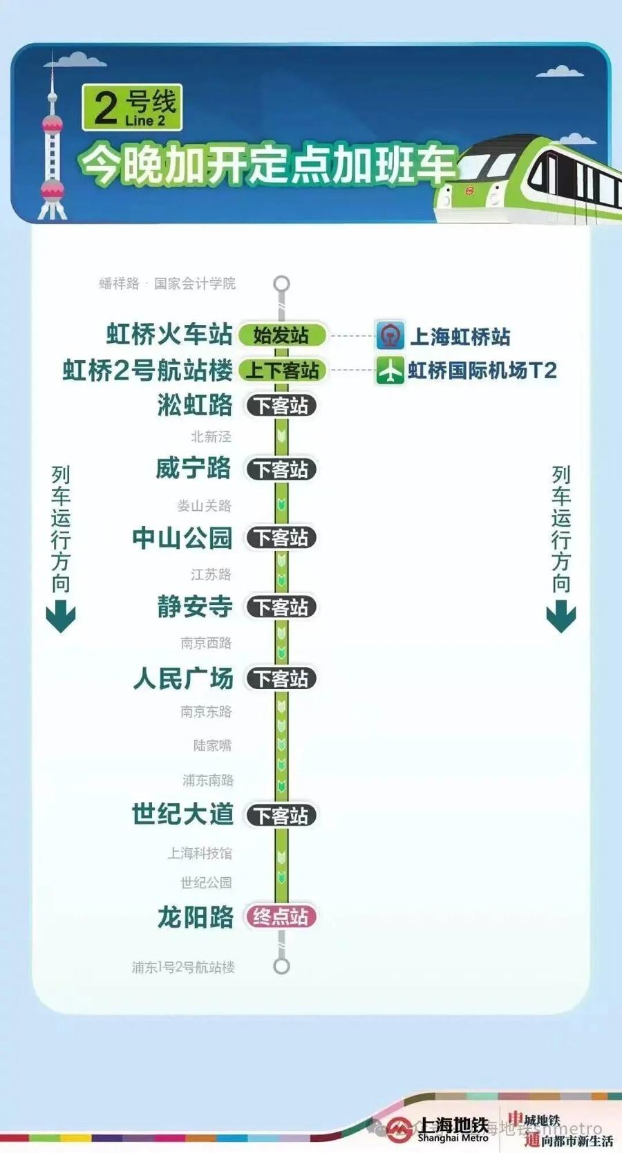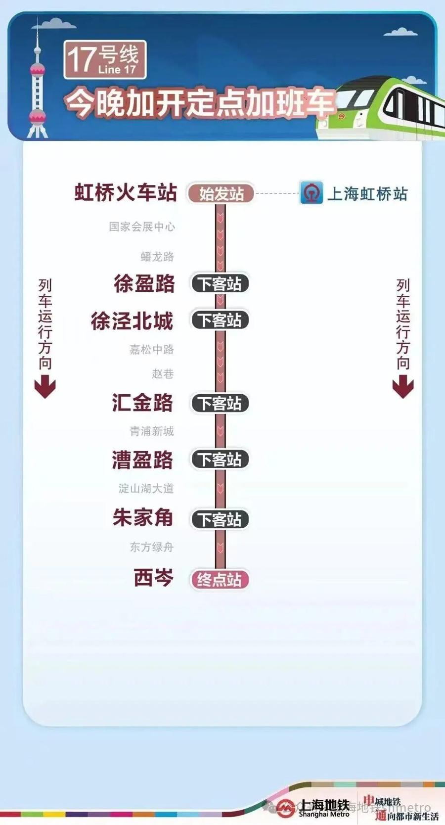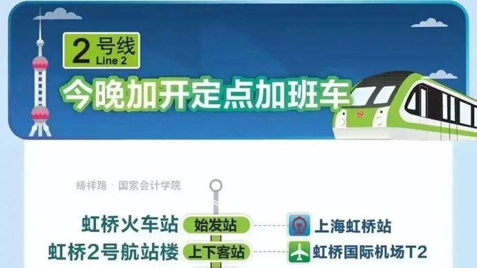 爲滿足春運期間乘客夜間出行需求,今晚(2月22日)2號線加開定點加班車,虹橋火車站站往龍陽路站加開至次日(2月23日)1時,10號線加開定點加班車,虹橋火車站站往五角場站加開至次日(2月23日)2時30分,17號線加開定點加班車,虹橋火車站站往西岑站加開至次日(2月23日)0時30分。定點加班車只停靠指定站點。