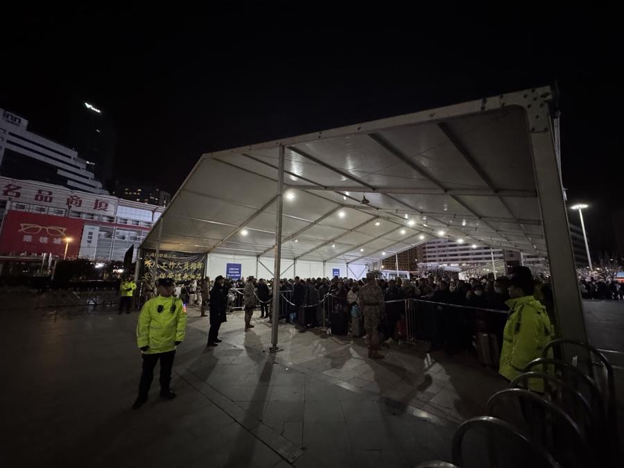 今天(2月23日)凌晨4點,在上海火車站的南廣場上,一座白色的臨時候車大棚格外引人注目。深夜,這爲等待地鐵頭班車的旅客提供了庇護。站區工作人員吳炯和同事們正在引導旅客有序進入車站候車方陣,等待進站。