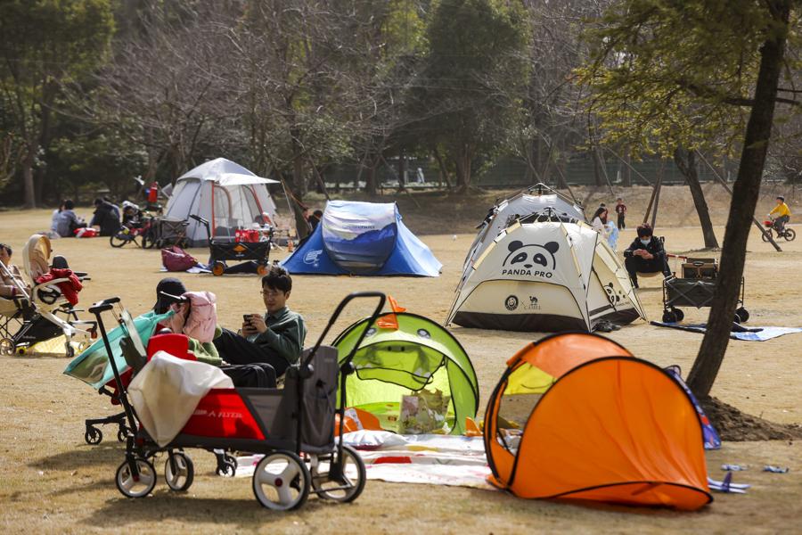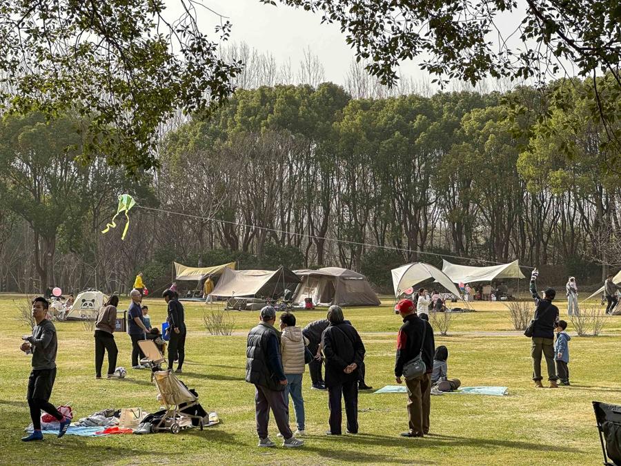 顧村公園人氣聚集。櫻花林中,大漁櫻、鍾花櫻等早櫻品種在氣溫催化下悄然綻放,粉白花瓣綴滿枝頭,景緻清新雅緻,吸引遊客駐足拍照。園區遊樂園裏,家長帶着小朋友盡情遊玩,歡聲笑語此起彼伏;大片草坪上支起了成片的露營帳篷,市民圍坐其間閒談休憩,沉浸式親近自然,享受假日的愜意時光。