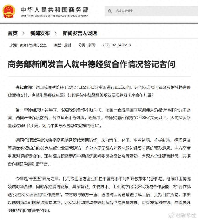 有記者問:德國總理默茨將於2月25日至26日對中國進行正式訪問。請問雙方屆時在經貿領域將有哪些活動安排,有望取得哪些成果?如何評價中德經貿關係發展現狀及未來合作前景?