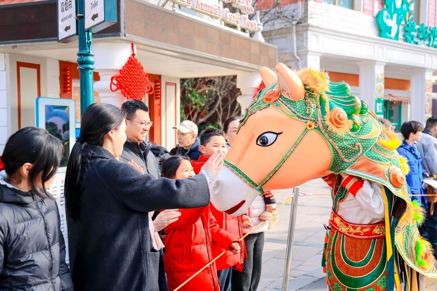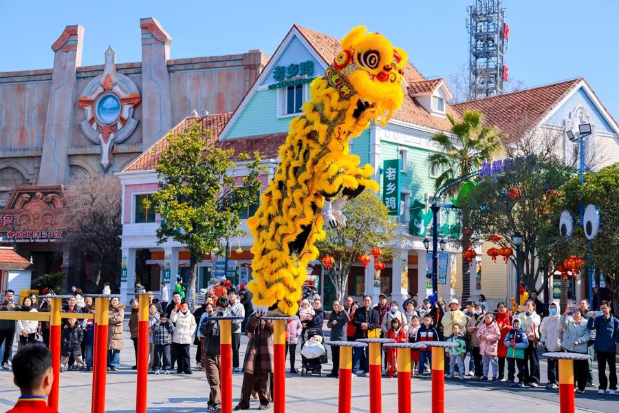 同時,園區特別推出馬年定製非遺大戲《神駒獻瑞》,融合高蹺儺舞、高蹺龍璃、馬頭舞等表演,展現傳統藝術魅力。此外,火舞、梅花樁舞獅、頂缸等雜技演出以及《歡樂迎賓》《超級馬力》花車巡遊等近百場主題演藝全天輪番上演,營造濃厚春節氛圍。