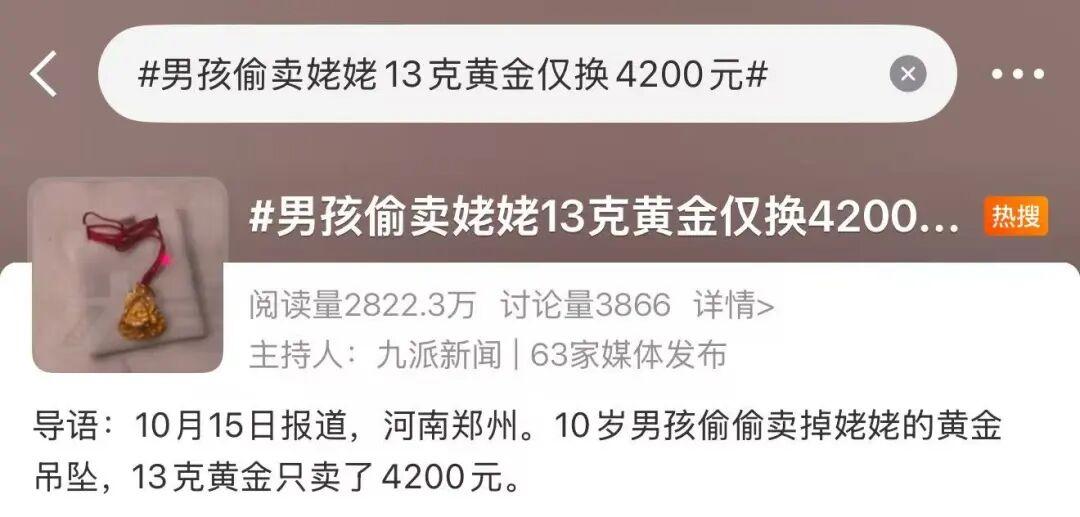 2025年10月,河南10歲男孩偷偷賣掉姥姥的黃金吊墜,13克黃金賣了4200元。