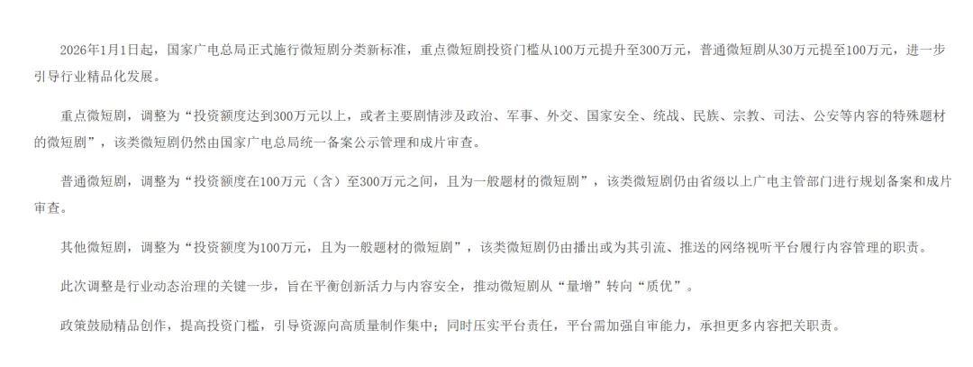 從2026年1月起,廣電總局將重點微短劇的投資門檻從100萬元提升至300萬元。這代表了行業共識的形成:短劇要想走得更遠,就得按電影的規矩來——更合理的製作週期、更精良的服化道、更專業的創作團隊。
