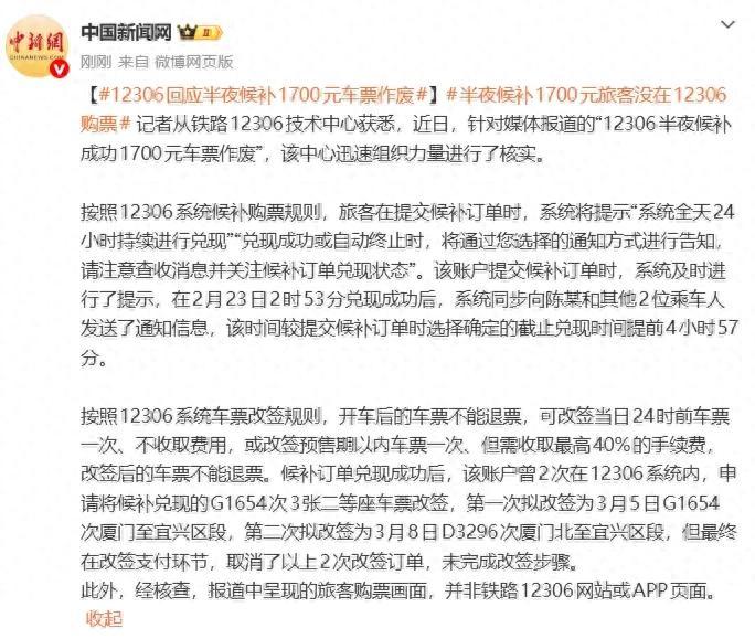 12306回應“半夜候補1700元車票作廢”:報道中的購票畫面並非鐵路12306官方頁面