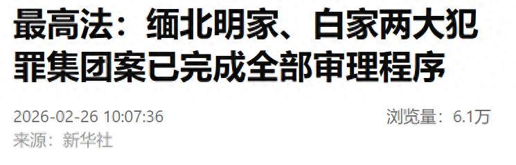 記者2月26日從最高人民法院舉行的新聞發佈會獲悉,截至2025年底,全國法院已一審審結涉緬北電詐犯罪案件2.7萬餘件,判處緬北電詐迴流人員4.1萬餘人。特別是境內外廣泛關注的緬北“四大家族”犯罪集團案,明家、白家兩大犯罪集團案已完成全部審理程序,39人被判處無期徒刑以上刑罰,其中16人被判處死刑立即執行,兩大跨境武裝犯罪集團被徹底摧毀,有力打擊了境內外不法分子的囂張氣焰。