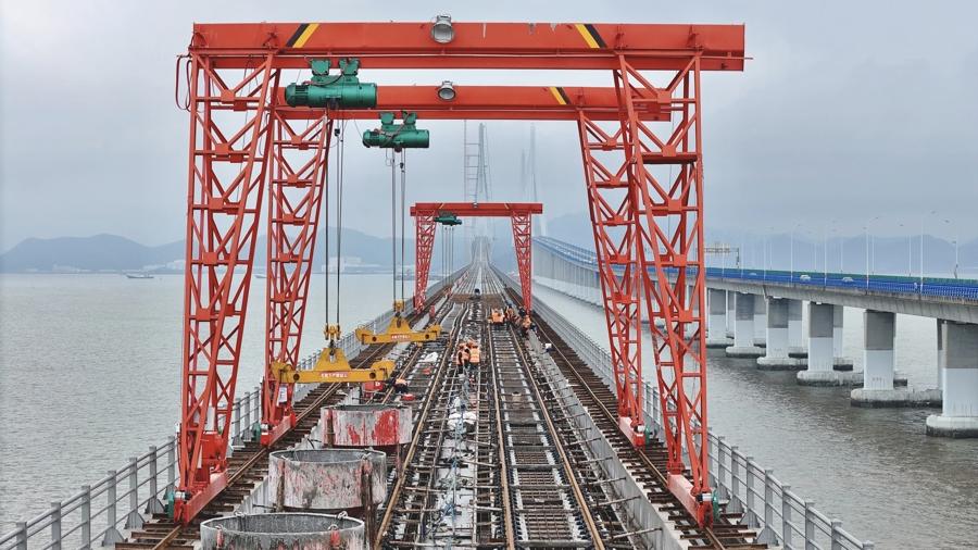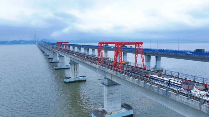 市域鐵路象山線(12號線)方面,爲確保市域鐵路象山港跨海大橋鋪軌施工高效推進,春節期間約有120名工人堅守崗位,同步推進大橋北岸引橋無砟軌道鋪設與主橋預壓作業,完成鋪軌800米,後續將加快主橋鋪設進度,全力衝刺象山線“軌通”目標。同時,在象山線雲龍車輛段的施工現場,粉刷、吊頂、機電安裝多線並進。目前單體裝修、機電安裝及鋪軌已進入收尾階段,正向接車任務全力衝刺。據介紹,雲龍車輛段建成後將承擔車輛檢修、維護、停放等功能,爲全線運營提供堅實保障。