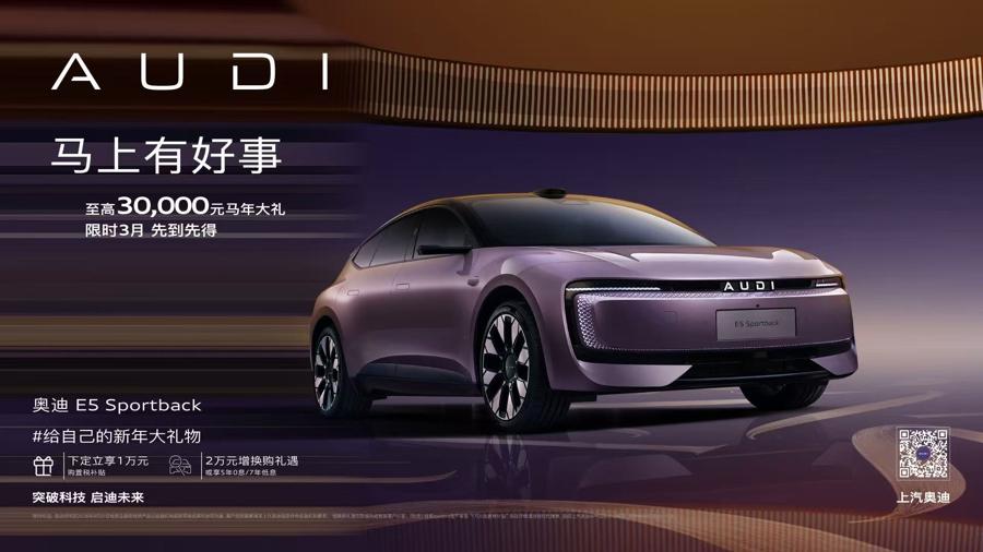 春節假期剛過,上汽奧迪打響豪華品牌“第一炮”。即日起至3月31日,奧迪 E5 Sportback限時放出至高3萬元大禮包,權益後起售價僅爲20.59萬元。奧迪E5 Sportback這波福利誠意十足,提供兩種靈活選擇:用戶可選擇“1萬元購置稅+1萬元現金+1萬元增換購”的現金補貼,直接拉低購車成本;或者選擇“1萬元購置稅+ 5年0息/7年低息”的金融購車方案,這意味着,在和特斯拉類似金融政策的情況下,奧迪E5 Sportback 22.59萬元的入手門檻,比Model 3便宜近1萬元,讓用戶輕鬆擁有高品質豪華出行體驗。春節期間,上汽奧迪還攜手豆包推出科技好禮,春晚直播期間,用戶在豆包APP參與抽獎互動即可贏取車型使用權。