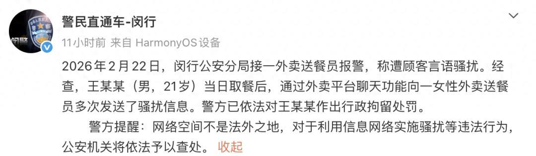2月26日晚,上海警方 發佈警情通報:2026年2月22日,閔行公安分局接一外賣送餐員報警,稱遭顧客言語騷擾。經查,王某某(男,21歲)當日取餐後,通過外賣平臺聊天功能向一女性外賣送餐員多次發送了騷擾信息。警方已依法對王某某作出行政拘留處罰。