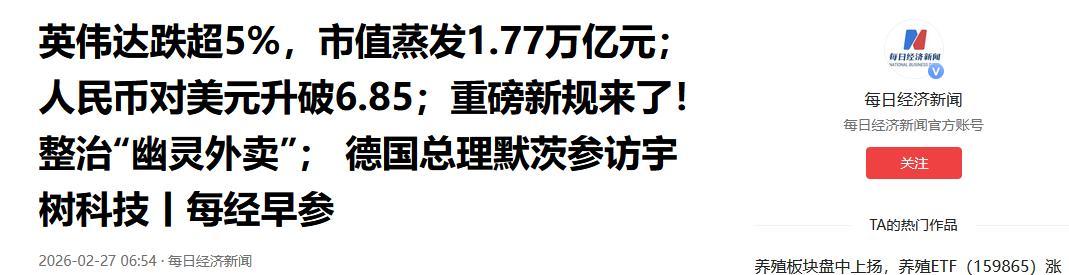 參考信源:《英偉達跌超5%,市值蒸發1.77萬億元;人民幣對美元升破6.85;重磅新規來了!整治“幽靈外賣”; 德國總理默茨參訪宇樹科技丨每經早參》2026-02-27 06:54·每日經濟新聞