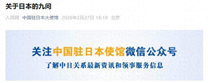 中國駐日本大使館2月27日轉發人民網評論員文章《關於日本的九問》。全文如下: