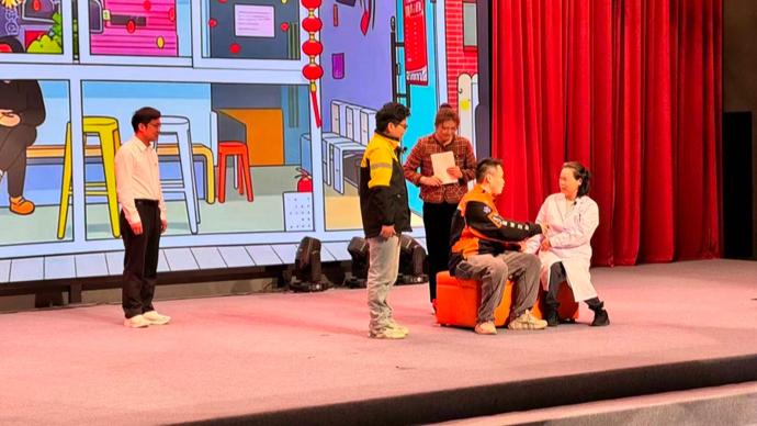 “街道特別爲小哥們開通了‘家庭醫生綠色通道’——不管你是不是本地戶口,都能籤!以後有小毛小病不用跑醫院,直接打電話問我就行,還有‘騎手健康檔案’定期跟蹤你們的健康狀況……”舞臺上,來自虹口區北外灘社區衛生服務中心的李醫生向外賣小哥介紹“家庭醫生”服務。在今天於北外灘街道社區文化活動中心星空劇場舉辦的“理潤虹口”新春走基層大巡講現場,這一源於真實生活的案例以情景劇《軌跡·溫度》形式被搬上“理論宣講小劇場”,成爲虹口區理論傳播“精準滴灌”的新實踐,亦是理論宣講“全域浸潤”的新落點。