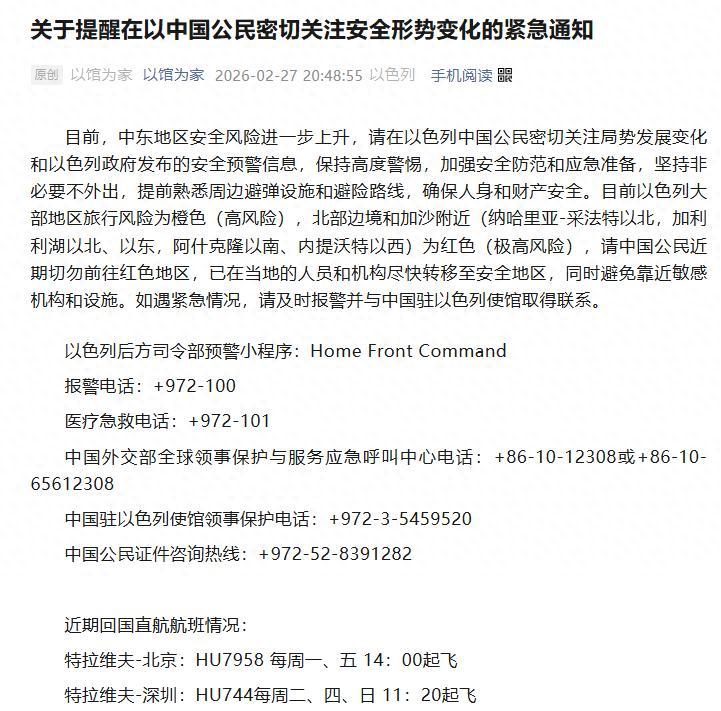2月27日,中國駐以色列大使館發佈緊急通知稱中東地區安全風險進一步上升,請在以色列中國公民密切關注局勢發展變化和以色列政府發佈的安全預警信息,保持高度警惕,加強安全防範和應急準備,堅持非必要不外出,提前熟悉周邊避彈設施和避險路線,確保人身和財產安全。