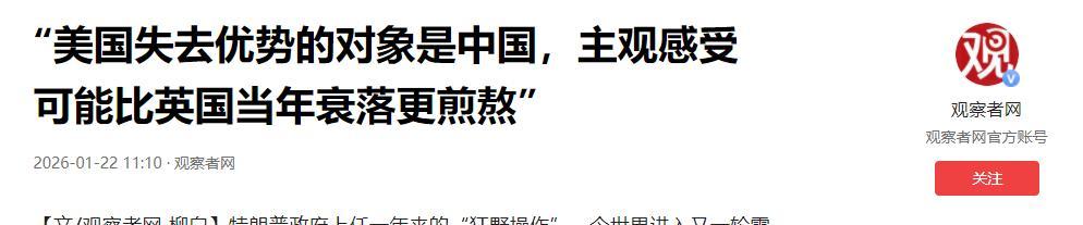 “美國失去優勢的對象是中國,主觀感受可能比英國當年衰落更煎熬”2026-01-22 11:10·觀察者網