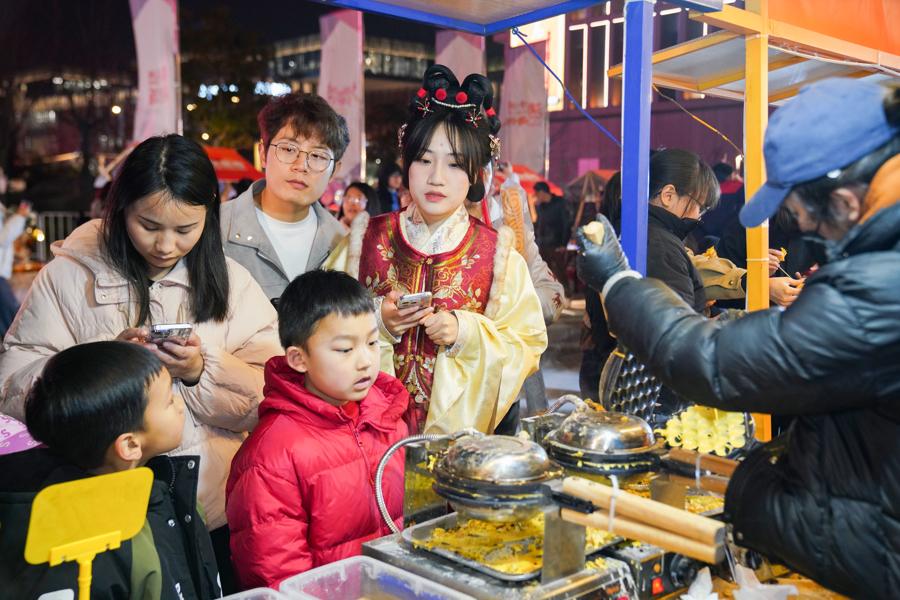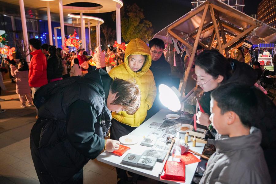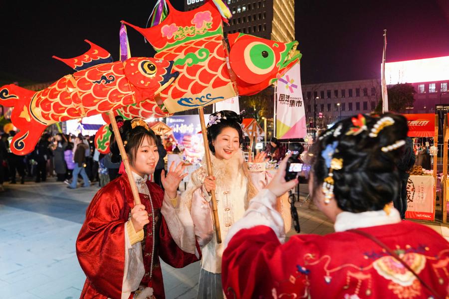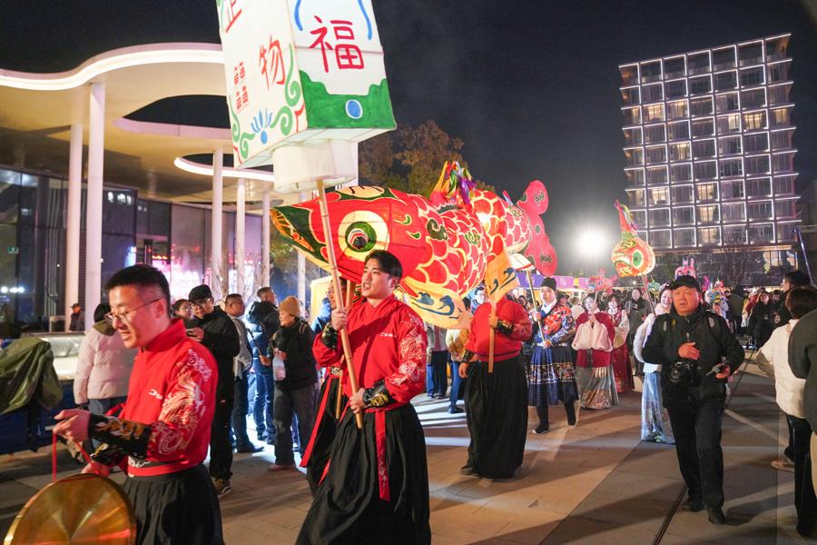 圖靈集市現場,新年美陳與巨大燈籠裝置前人頭攢動,市民遊客紛紛駐足打卡,造型靈動的傳統魚燈遊搖曳穿梭,傳遞元宵佳節濃濃的熱鬧年味與傳統韻味。