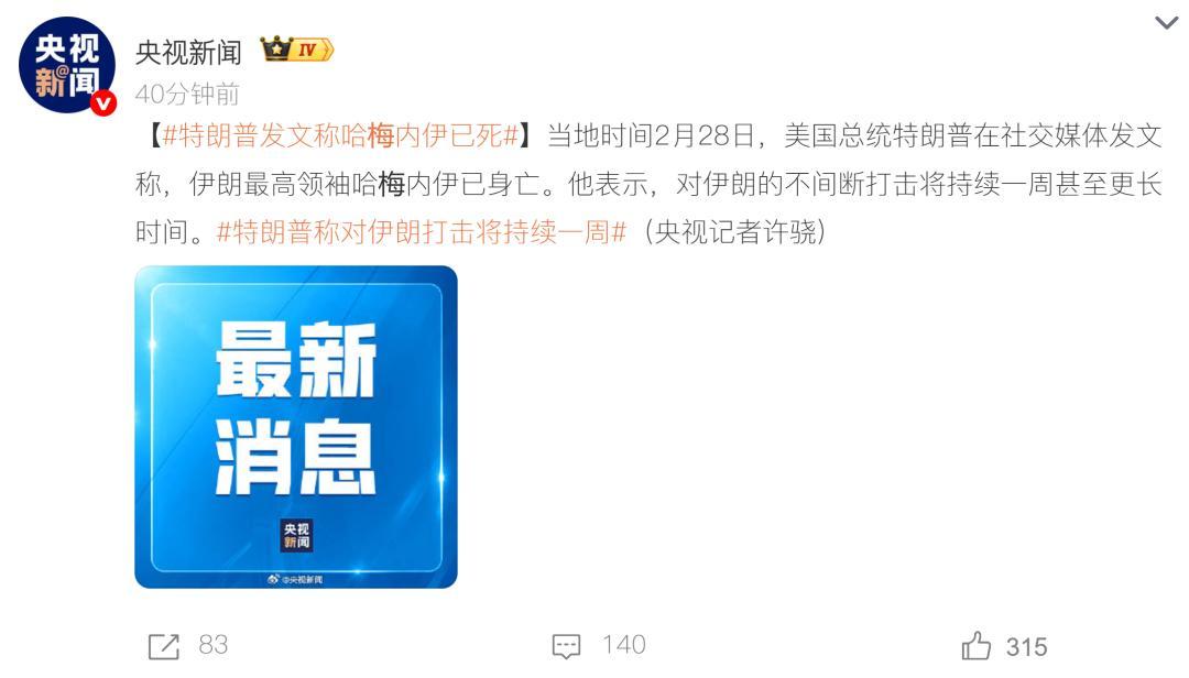 據央視新聞消息,當地時間2月28日,美國總統特朗普在其社交媒體“真實社交”發文表示,伊朗最高領袖哈梅內伊已身亡,並表示美國和以色列對伊朗的轟炸仍將繼續。