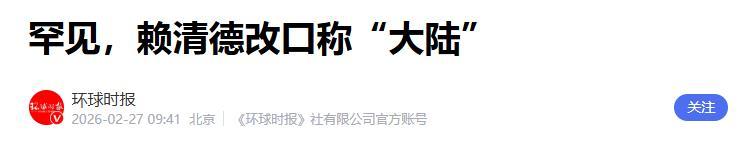 罕見,賴清德改口稱“大陸”.環球時報.2026-02-27 09:41.