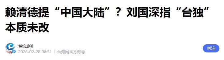 賴清德提“中國大陸”?劉國深指“臺獨”本質未改.臺海網.2026-02-28 08:51.