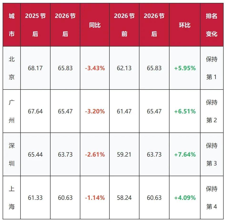 58安居客的春節二手房報告裏說,2026年春節全國平均二手房找房熱度節前64.41、節後69.51,較2025年分別下降1.77%和3.11%,2026年也是四年來熱度趨勢的低點。