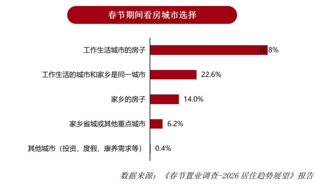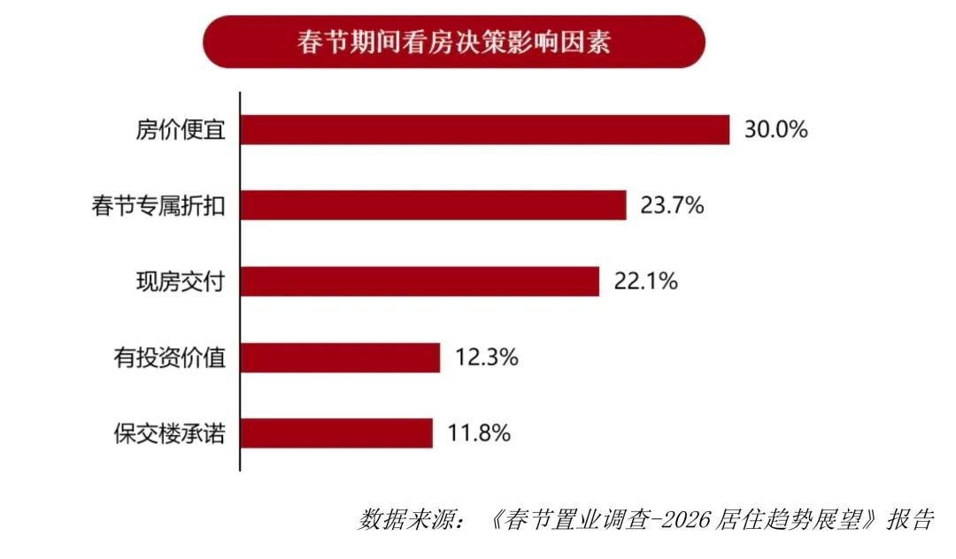 在調研中,價格因素成了絕對的主導。“房價便宜”(30%)“春節專屬折扣”(23.7%)排在決策因素前列。