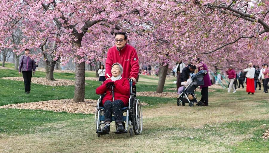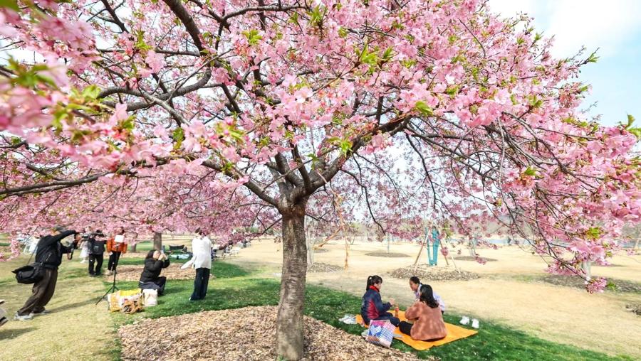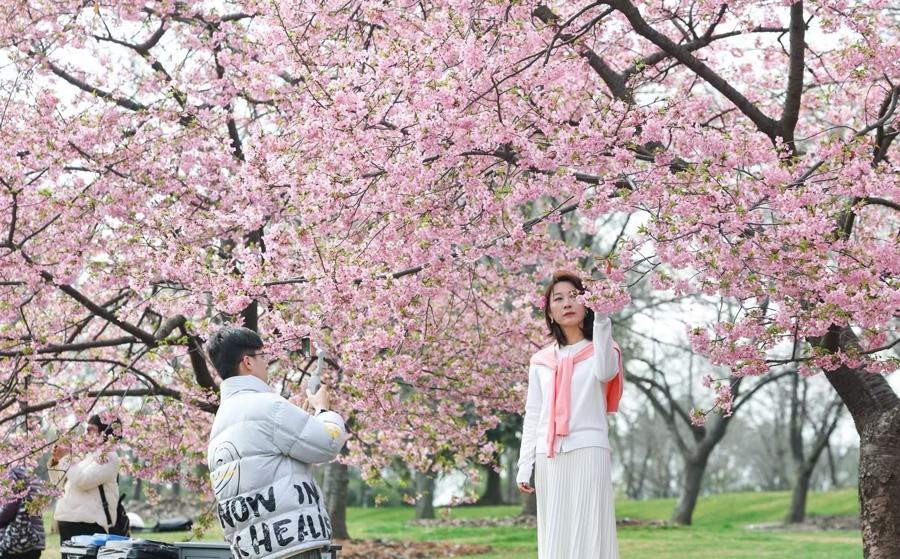 2月28日,上海辰山植物園櫻花迎來盛花期,繁花如雲、燦若雲霞,吸引衆多市民遊客前來賞櫻打卡。