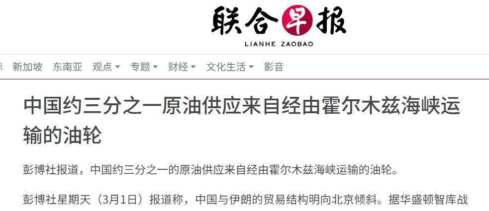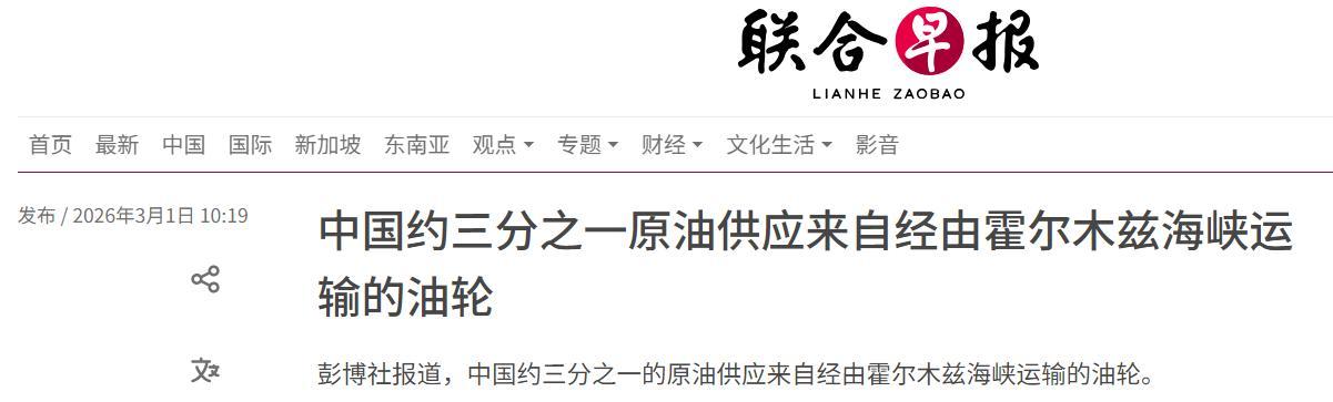 中國約三分之一原油供應來自經由霍爾木茲海峽運輸的油輪 聯合早報 2026年3月1日 10:19