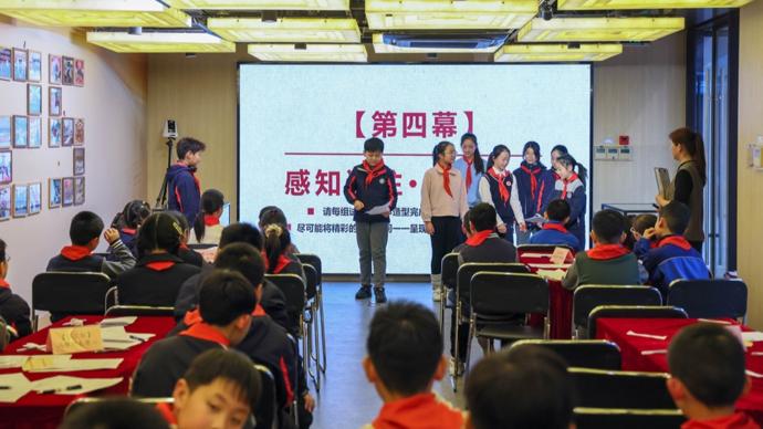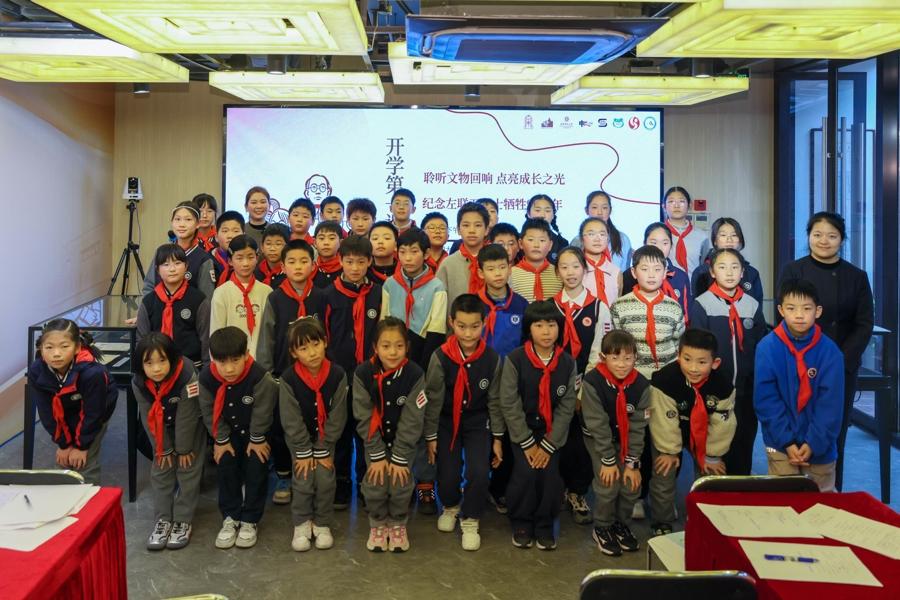 今年是“左聯五烈士”犧牲95週年。這幕由小學生現場排演的微短劇,是今天在中共四大紀念館舉辦的2026年開學第一課“如果文物會說話——左聯五烈士的故事尋寶記”中的一個環節。現場共展示了5件與“左聯五烈士”相關的左聯會址紀念館藏品,40餘名小學生通過觀察文物、聆聽講解、演繹歷史片段、撰寫感悟等,化身“文物代言人”感知、瞭解、傳播這段歷史。