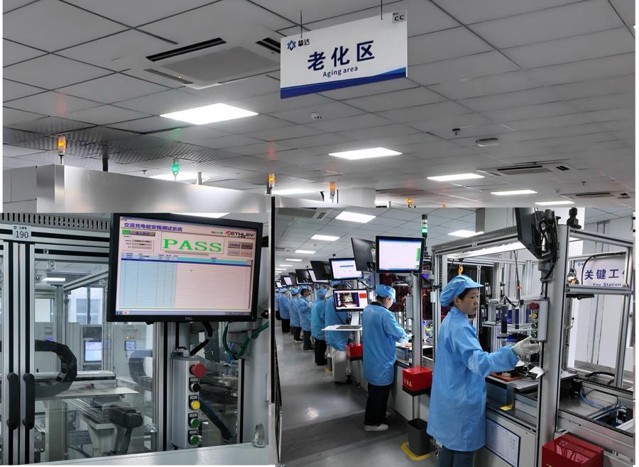 丙午馬年初十,總部位於上海楊浦區的摯達科技有限公司安徽宣城工廠車間內,記者看到,一條二十多米的產線上,十多位工人正全神貫注:開關、測試設備、充電槍線、供電關鍵工序的安裝一氣呵成。伴隨着陣陣嗡鳴的機械聲,每個工位上MES系統實時錄入螺釘安裝數量、扭矩、角度等各環節的操作數據。人工組裝完成後,傳送帶鏈條上的充電樁設備就迎來關鍵的強壓與高溫即老化測試,如同闖關,極端溫度、溼度、電壓三種測試輪番上陣,室外屏幕上實時顯示着通過的程度。