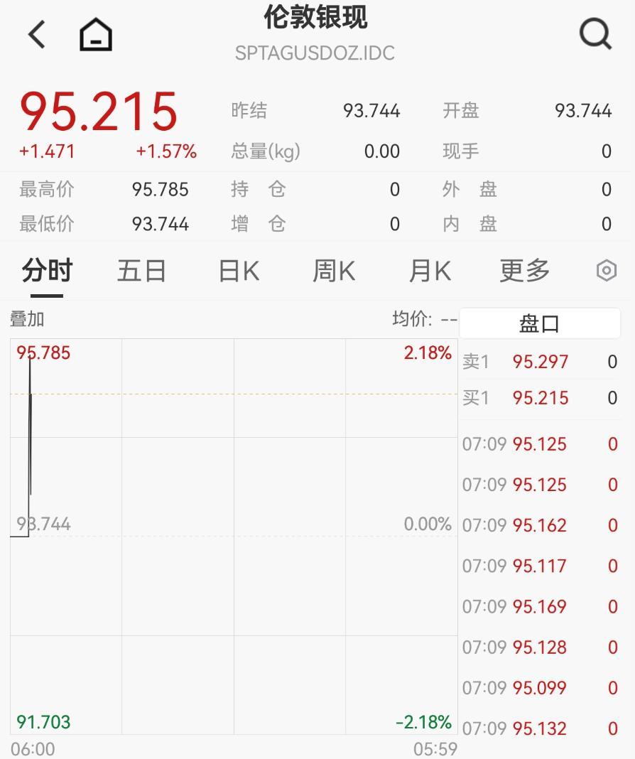 現貨白銀站上95美元/盎司大關,盤初漲超2%。