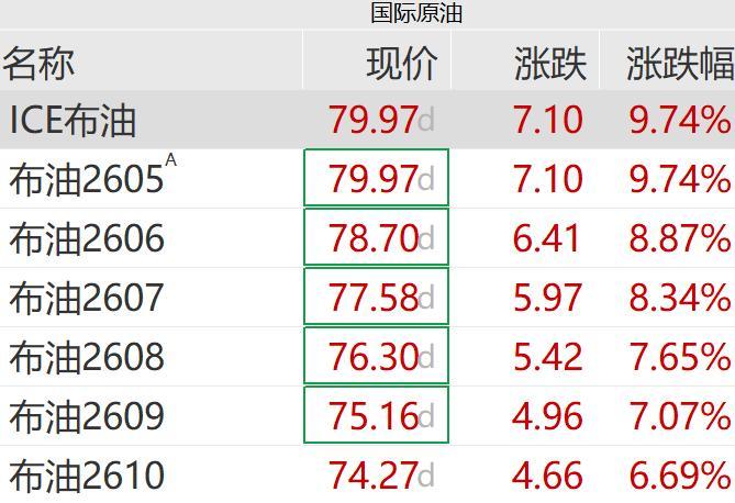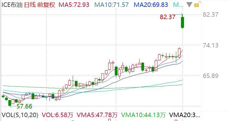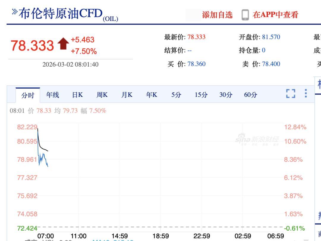 油價方面,布倫特原油開盤暴漲近13%,爲81.57美元/桶。截至發稿前,布倫特原油報78.333美元/桶,漲幅爲7.50%。