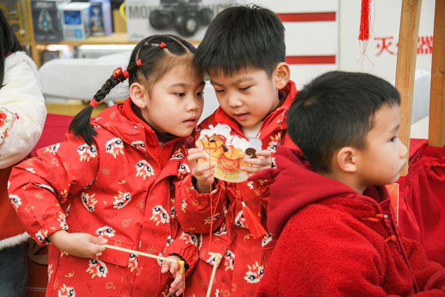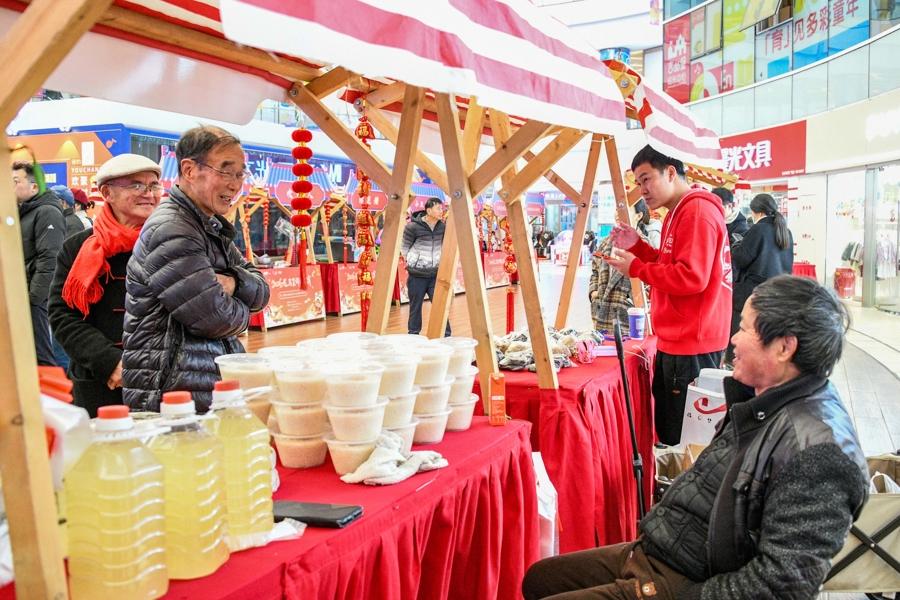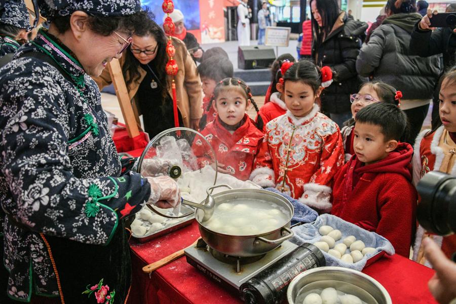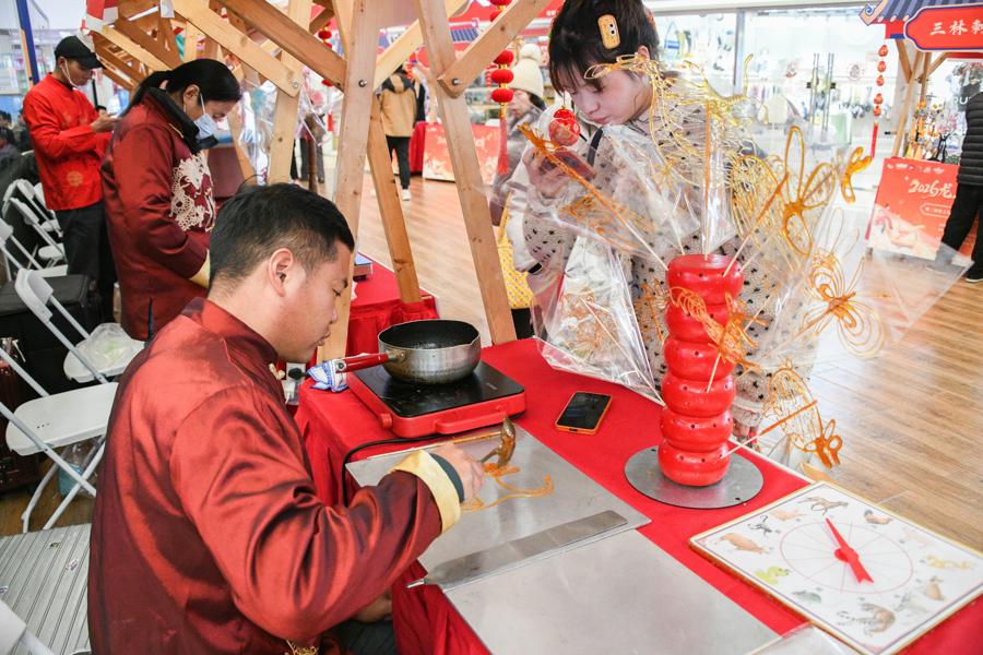 主活動區的快閃舞龍贏得滿堂彩。三林的賢姑巧姨們和鎮裏身着鮮豔服飾的少數民族同胞共包湯圓。一碗碗湯圓、一盒盒塌餅串起了三林人鄰里相望的淳樸情誼。扎花燈也是元宵節的習俗之一,親友相偕而來,民間藝人現場展示花燈的製作,教年輕人和孩子們製作兔子花燈。糖畫、吹糖人、棉花糖等各色非遺項目攤位也被一併“端”出來參與互動展示,這些非遺項目涉及喫穿住用,跨越百年傳承,在現代生活中仍保持着旺盛的生命力。