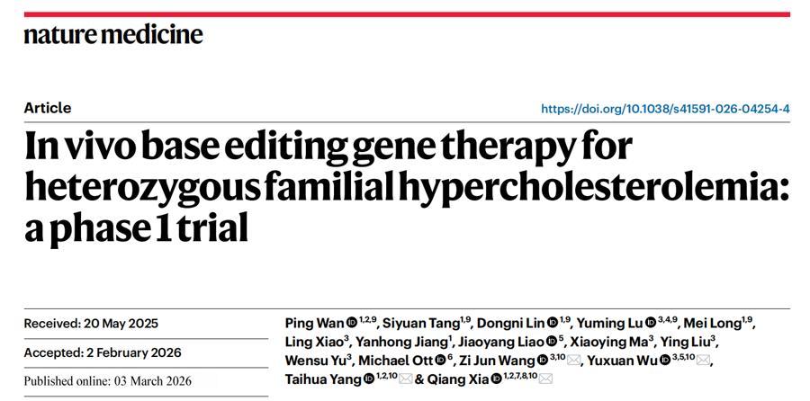 今天,上海交通大學醫學院附屬仁濟醫院發表重磅科研成果,中國工程院院士、仁濟醫院院長夏強領銜的團隊,在國際頂尖學術期刊《自然・醫學》(Nature Medicine)發表全球首個運用肝臟靶向體內鹼基編輯技術治療雜合子家族性高膽固醇血癥的Ⅰ期臨牀試驗結果。這一研究首次在人體中證實了該基因治療手段的安全性和有效性,爲這一遺傳代謝性肝病患者擺脫終身用藥負擔帶來全新希望。