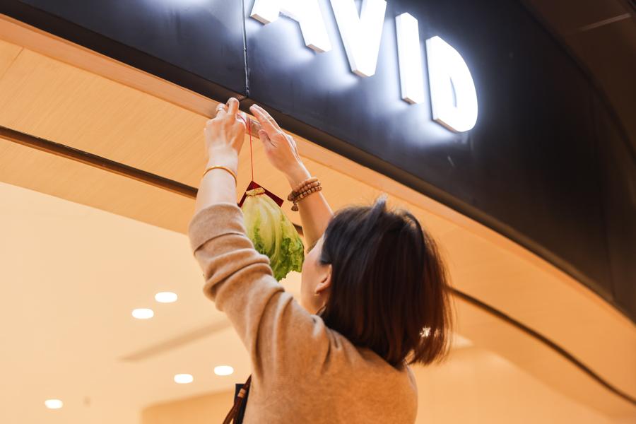 圖爲太古匯商戶在門頭掛上諧音“生財”的生菜,寓意新年生意興隆、事事順意。