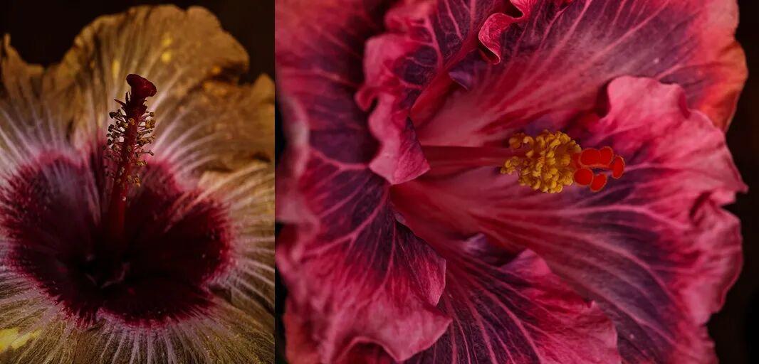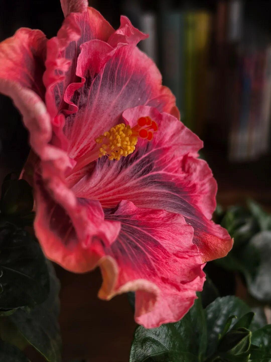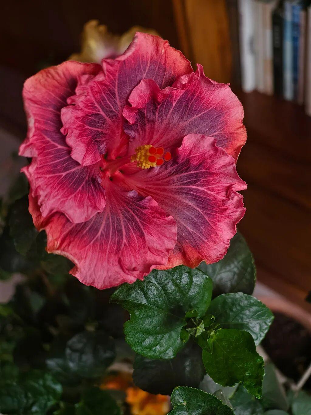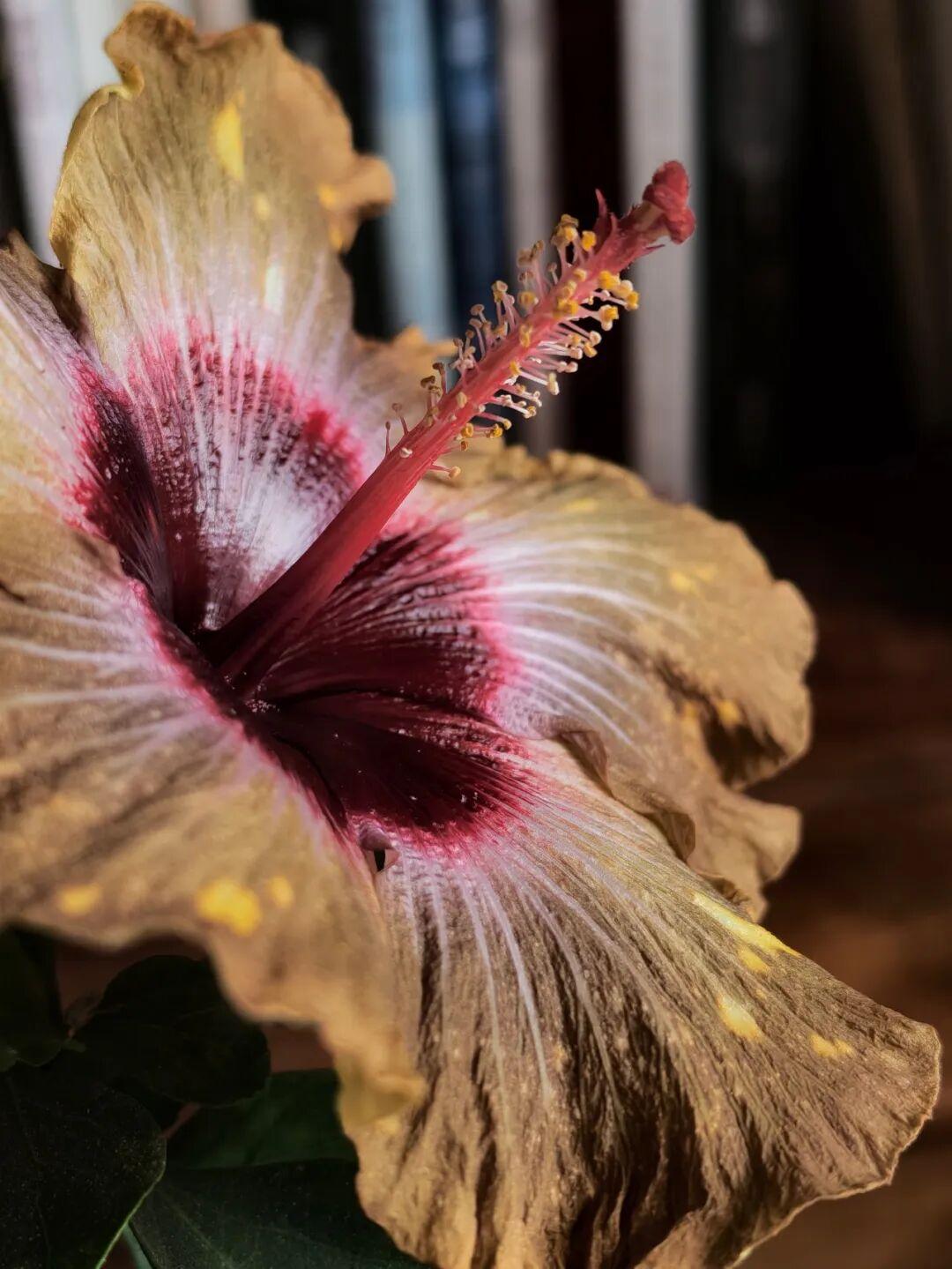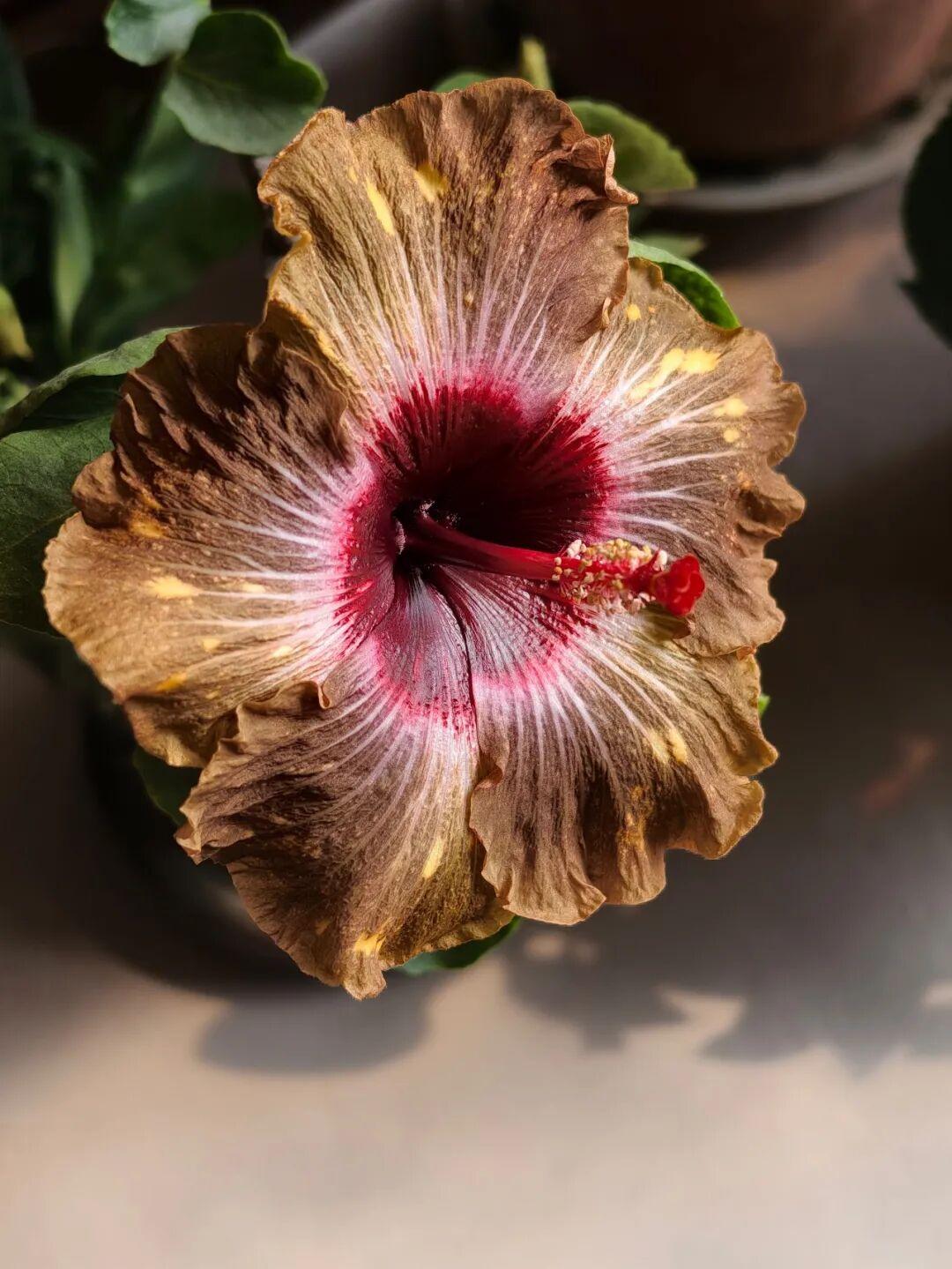 除冬天還能連續開花外,扶桑還有一個特點,那就是它的花多奇色。主要是其他種類的花沒有或很少有的紫黑、暗紫、灰紫色,還有黃褐、棕褐色,還有花瓣上不規則的色斑、脈紋等,花色還會隨氣溫高低發生變化。較早的時候我養過一盆橙色復瓣扶桑,這是中國的傳統品種。後來我還養了兩種奇色的扶桑,是2019年4月買的,到今年2026年已養了7年,每年冬天都在賞玩它們奇特的花色,至今沒有厭倦。其中一種叫“溼婆”(參見上、下圖:它的花心是深血紅色,花瓣是棕褐色,上面不規則地分佈着黃色斑點。冬天的時候棕褐色部分變深,黃色斑點減少。