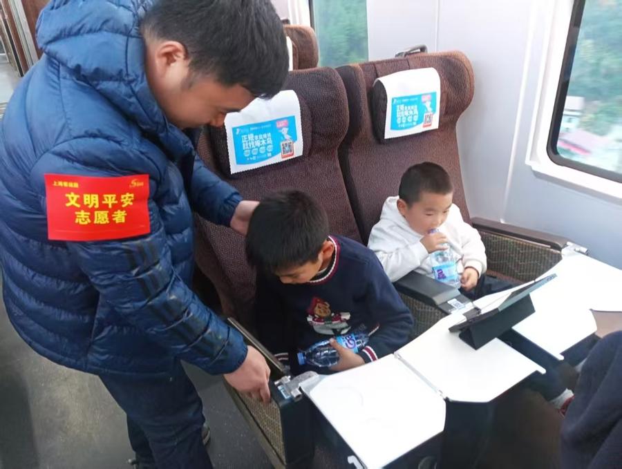 今年,依託“上海志願者”微信公衆號和列車廣播社會化招募588名來自教師、高校學生、醫護人員等有出行計劃的志願者,在上海至北京、昆明、西安、廣州、重慶等熱門線路的24趟列車上提供志願服務。旅途中,志願者協助乘務人員規整行李、消除安全隱患;發揮語言專長,爲外籍旅客提供翻譯與出行指引,搭建友好互動橋樑;同時與乘務員聯合開展消防安全宣傳,普及滅火器使用及乘車注意事項。值得一提的是,小小志願者在乘務員指導下化身“文明宣傳員”,以童真童趣倡導靜音車廂公約,帶動旅客共同營造安靜有序的出行環境。