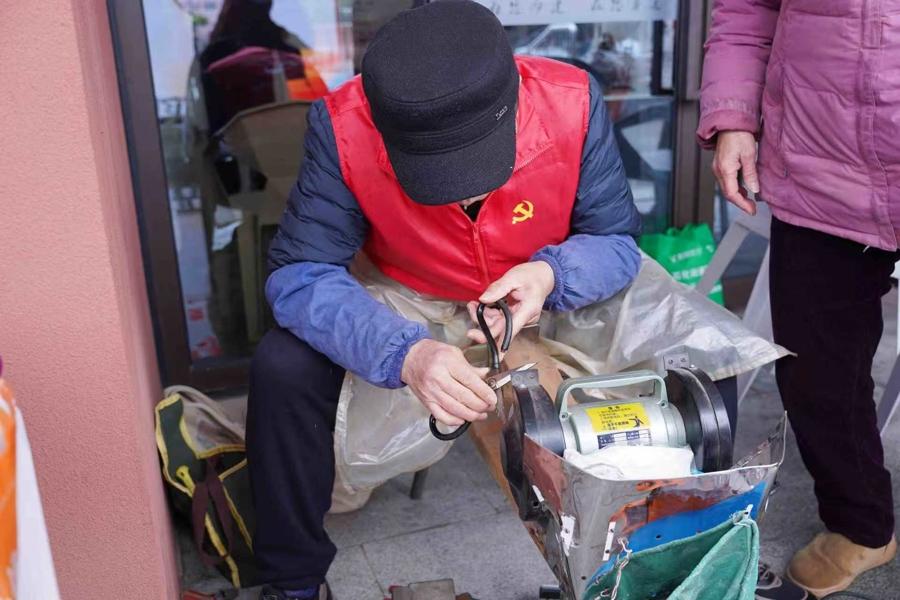 今天一早,家住金山石化街道柳城居民區的李阿姨就揣着兩把有些鈍了的菜刀,熟門熟路地朝着金山區街合一黨羣服務中心那個最“熱門”的攤位走去。攤位後,78歲的蔣世華師傅腰板筆直,手中的磨刀石正有節奏地發出“嚓嚓”的聲響,刀刃與石面摩擦濺起細小的水花。他的攤位前,早已自發排起了小小的隊伍,居民們手裏拿着刀具、剪刀,一邊等候,一邊嘮着家常。