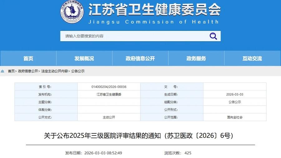 近日,江蘇省衛生健康委員會網站發佈《關於公佈2025年三級醫院評審結果的通知》。通知中稱,根據《醫院評審暫行辦法》《江蘇省醫院評審辦法》,2025年5月至2026年1月,江蘇省醫院評審委員會組織對24家醫院進行了評審工作,經審議並公示,現確認如下: