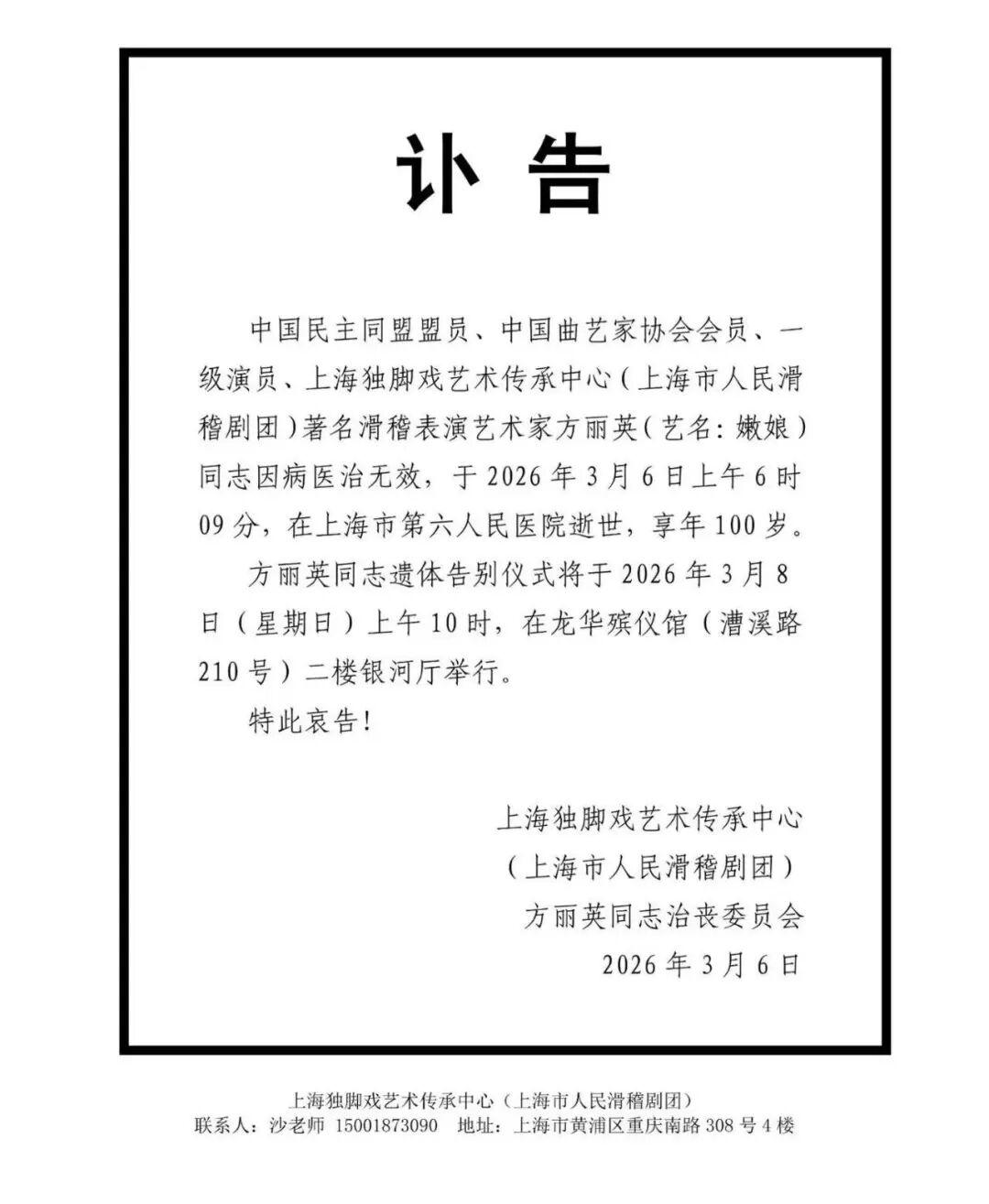 記者從上海獨角戲藝術傳承中心(上海市人民滑稽劇團)獲悉,上海觀衆熟悉的“老舅媽”、滑稽表演藝術家嫩娘於3月6日去世,享年100歲。上海主持人曹可凡在社交媒體上寫道:“一代滑稽藝術大師嫩娘老師今日以百歲高齡駕返瑤池。深切緬懷她老人家!”
