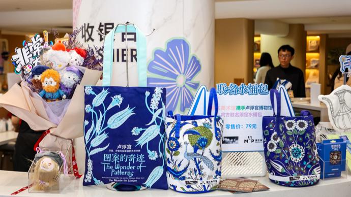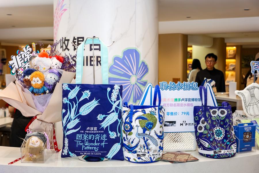 令人驚喜的是,快閃店新裝亮相當天,兩大系列文創產品全新發布。三款盧浮宮與浦東美術館官方聯名水桶包、帆布包,春日氣息滿滿。浦東美術館文創設計師陳杰妮告訴記者,水桶包推出藍、白兩款配色,圖案靈感分別來源於盧浮宮大展中精美絕倫的展品《花束圖盤》和《孔雀圖盤》,細膩紋樣勾勒藝術美感,兼具時尚感與實用性;帆布包同樣以盧浮宮大展中的經典花卉元素爲設計靈感,清新雅緻。快閃期間,三款包僅可在線下購買。