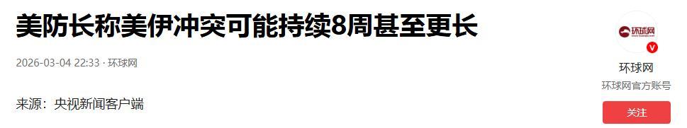 美防長稱美伊衝突可能持續8周甚至更長.2026-03-04 22:33·環球網.