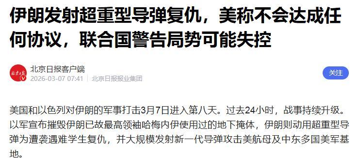 伊朗發射超重型導彈復仇,美稱不會達成任何協議,聯合國警告局勢可能失控.北京日報客戶端.2026-03-07 07:41.