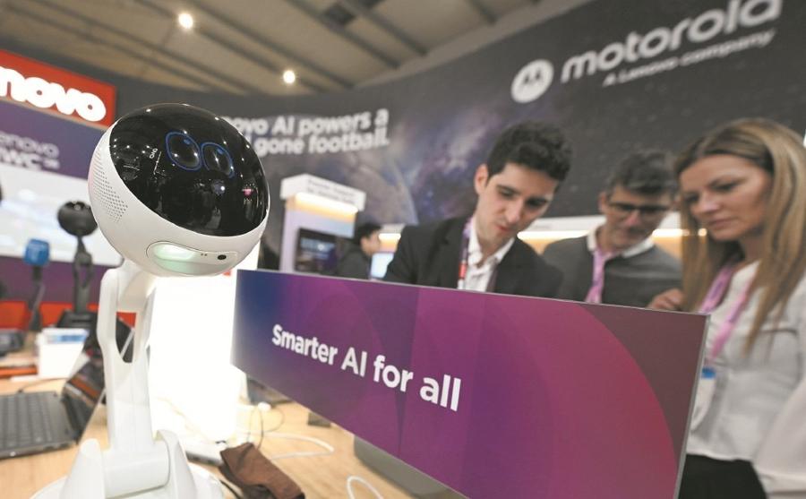 近日,在以“智能時代”爲主題的2026年世界移動通信大會上,來自中國的技術精彩亮相,在人工智能、雲平臺等領域展示了中國技術的實力。圖爲工作人員在聯想展臺交流洽談。 新華社記者 程敏攝