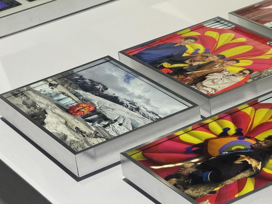 同期展出的還有藝術家宋三土的《宇宙之花,萬物心景》主題藝術作品。一幅幅畫面傳遞着大自然的智慧與慈悲,鮮豔多姿的高山花朵在她的作品中綻放,少數民族女性美麗的臉龐在高原上如花般自信盛開。2025年6月,受自然堂集團邀請,她深入林芝,開啓了一場“向內的尋花之旅”。在色季拉山,她遇見了塔黃、雪蓮、綠絨蒿等九種高山花朵,這些被賦予星辰之名的植物,成爲她筆下“心靈花卡”的靈感來源。
