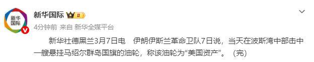 伊朗伊斯蘭革命衛隊7日說,當天在波斯灣中部擊中一艘懸掛馬紹爾羣島國旗的油輪,稱該油輪爲“美國資產”。