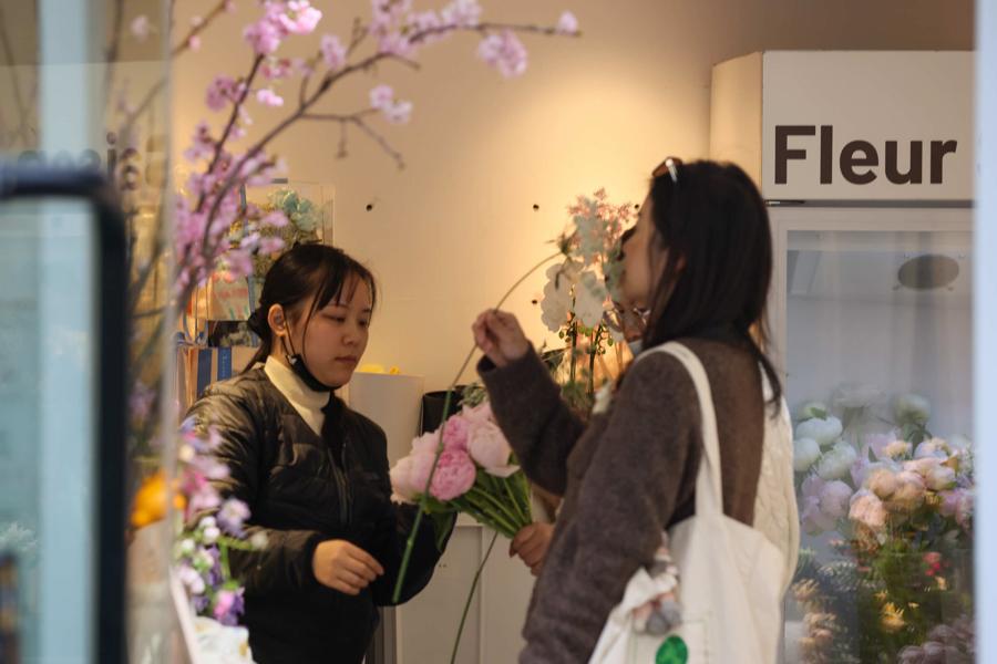 街頭花店蘊含生機,幾位女士進店購買鮮花,帶着春天的芬芳回家