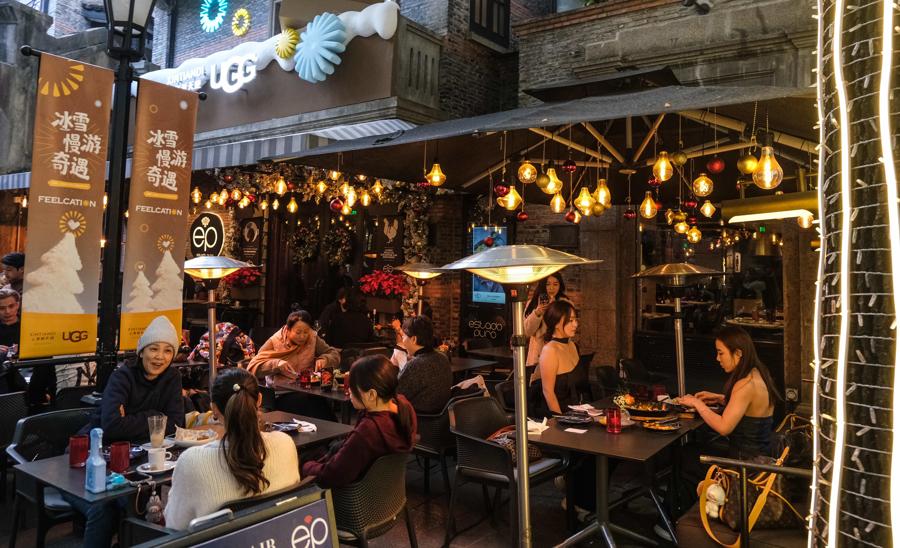 傍晚,女性市民遊客正在新天地酒吧外擺位上享用美食,感受魔都夜色