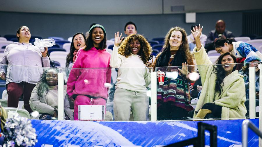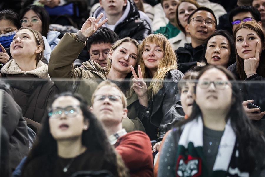 在東方體育中心舉行的KHL大陸冰球聯賽世界賽上海站的比賽現場,看臺上出現了許多女性觀衆的身影