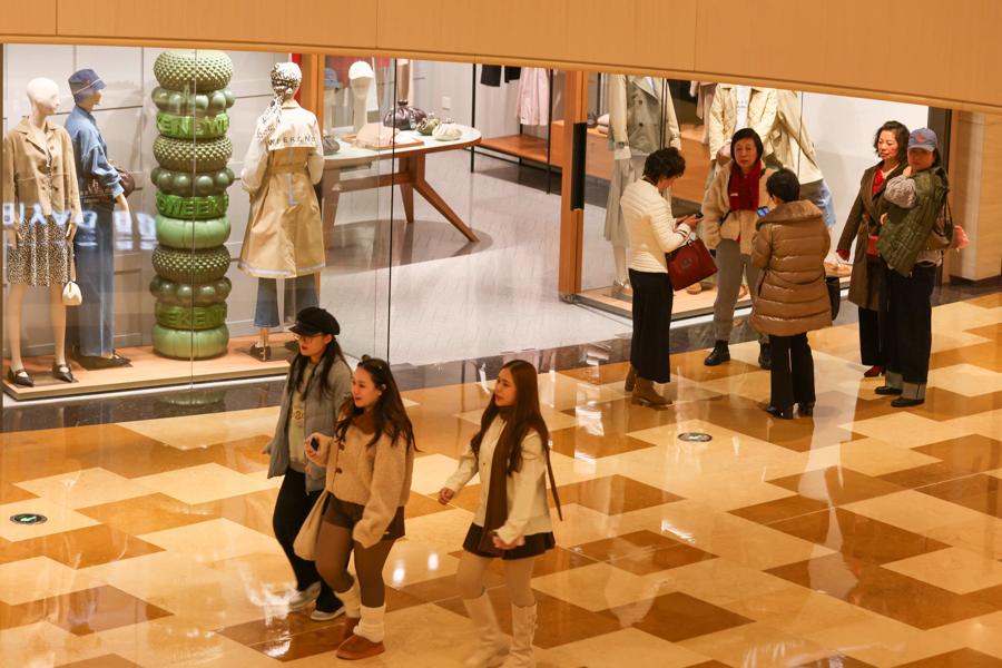 在靜安的一家商場裏,時尚麗人與都市女性路過